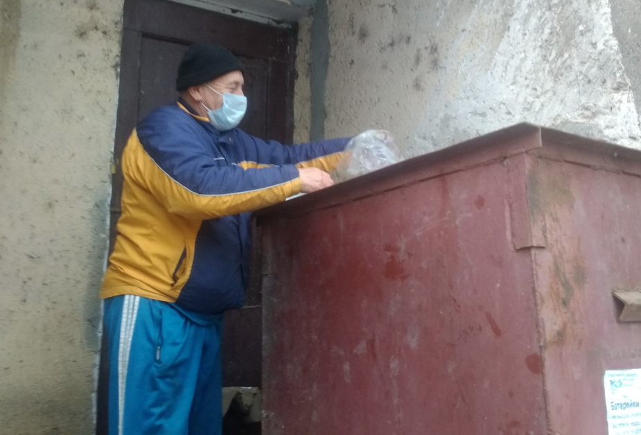 Пожилой мужчина роется в мусорке - в маске! Соблюдает правила!