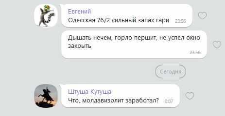 по факту - воняет ПОЛ года. И на клочке земли в "100" квадратов (тирасполь) "не могут" найти откуда воняет. И добивает еще то что профильное ведомство " впаривает" про какое то сжигание пластин. Ну все , просто все "ржут" над этой версией!!! Поэтому и падает доверие к специалистам, профильное же ведомство по новостям давало комментарии по поводу "вони" в Тирасполе. Всё просто - нада решить вопрос - прекратить вонь!! И тогда будет и доверие... Эта экологическая ситуация длится многие годы (даже если запахи раньше и не чувствовались). Проблема "вспыхивала" и сама собой затихала. Видать и сейчас на это рассчитано... |