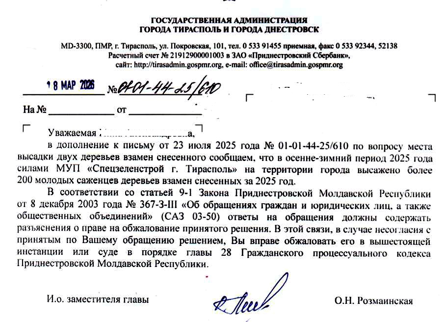Направили следующее письмо в ГА Тирасполя, надеюсь всё же высадят 2 дерева к 1 вместо незаконно спиленного дерева.