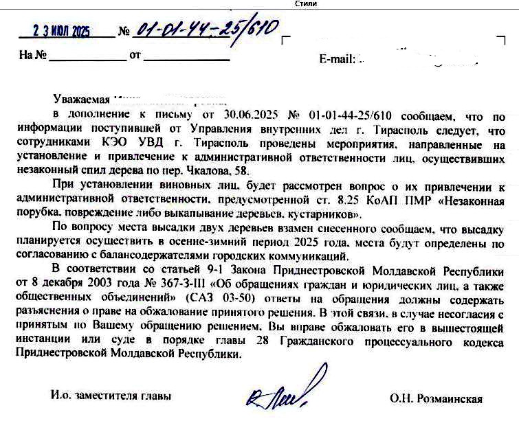 в дополнение к письму от 30.06.2025 № 01-01-44-25/610 сообщаем, что по информации поступившей от Управления внутренних дел г. Тирасполь следует, что сотрудниками КЭО УВД г. Тирасполь проведены мероприятия, направленные на установление и привлечение к административной ответственности лиц, осуществивших незаконный спил дерева по пер. Чкалова, 58. При установлении виновных лиц, будет рассмотрен вопрос о их привлечении к административной ответственности, предусмотренной ст. 8.25 КоАП ПМР «Незаконная порубка, повреждение либо выкапывание деревьев, кустарников». По вопросу места высадки двух деревьев взамен снесенного сообщаем, что высадку планируется осуществить в осенне-зимний период 2025 года, места будут определены по согласованию с балансодержателями городских коммуникаций. В соответствии со статьей 9-1 Закона Приднестровской Молдавской Республики от 8 декабря 2003 года № 367-З-III «Об обращениях граждан и юридических лиц, а также общественных объединений» (САЗ 03-50) ответы на обращения должны содержать разъяснения о праве на обжалование принятого решения. В этой связи, в случае несогласия с принятым по Вашему обращению решением, Вы вправе обжаловать его в вышестоящей инстанции или суде в порядке главы 28 Гражданского процессуального кодекса Приднестровской Молдавской Республики. И.о. заместителя главы О.Н. Розмаинская Дополнение к 01-01-44-25/610. Вложение 30613 |