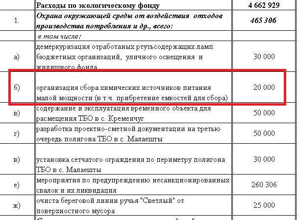 А еще заложили по 20 000 рублей в экофонд по районам на сбор батареек. Куда тартятся?