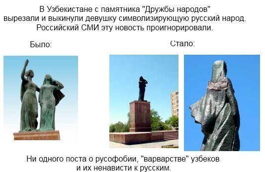 Поэтому в Узбекистане все за Русский Мир, так как кроме ликвидации ,при нем, гражданской войны, у них появилась возможность получить бесплатно недвижимость,в которой есть электрическая лампочка Ильича, централизованная подача тепла для обогрева , их научили пользоваться санузлом и обьяснили - для чего он нужен, а также они теперь могут выражать свои мысли не только в устной речи, но и письменно, они теперь даже знают -почему идет дождь. Все вышеперечисленное дает право утверждать . что племена проживающие на территории современного Узбекистана, как никогда благодарны своим завоевателям, в отличии от таких же племен проживающих на территории Пиндостана,которые благодаря Пиндостану сократили свою численность в 63,5 раза и загнанны в резервации за пределы которых им запрещено выходить под страхом смерти. Вы ,чувствуете разницу, между жизнью и условиями выживания пиндосовских племен и племен проживающих на территории современного Узбекистана ? |