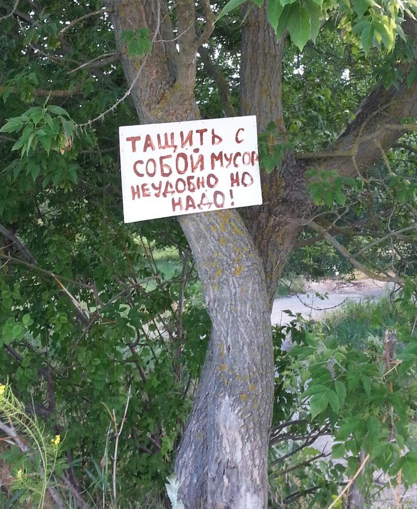 Мусорка - 500м со стрелкой) Территория под охраной. Муосрить ЗАПЕРЕЩЕНО. УБИРАЙТЕ за собой! Мусор НЕ БРОСАТЬ. Провели досуг - УБЕРИ вокруг Не будь свиньей -УБЕРИ за собой. Отдохнул - УБЕРИ за собой. Ну типа того - повелительное наклонение эффективнее на сознание действует. Я пока не думала, первое что в голову пришло. Еще слова красными буквами в начале предложения ВНИМАНИЕ! и.... действует. ) |