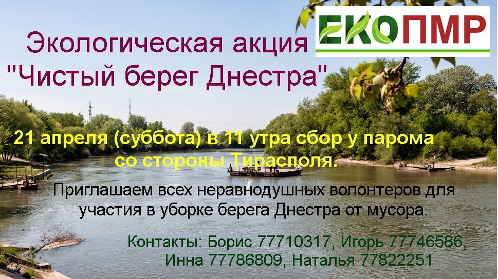 Вложение 24556 Экологическая акция "Чистый берег Днестра", волонтерское движение "Экопмр". 21 апреля в субботу в 11 утра сбор волонтеров у парома со стороны Тирасполя. Контакты: Борис 77710317, Игорь 77746586, Инна 77786809, Наталья 77822251 |