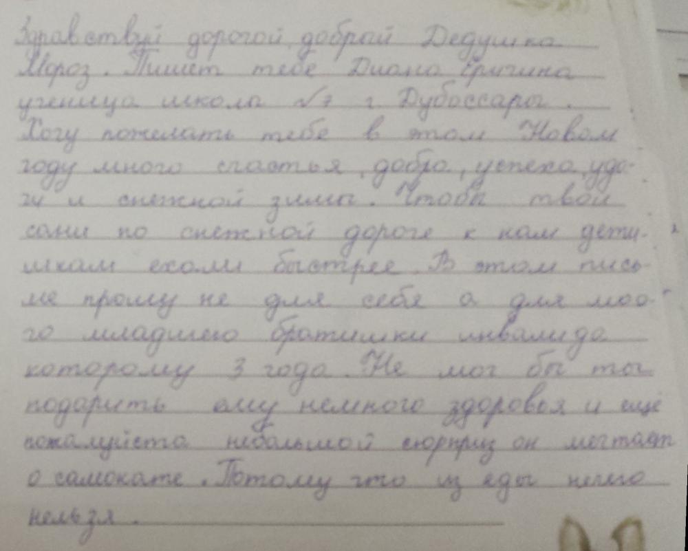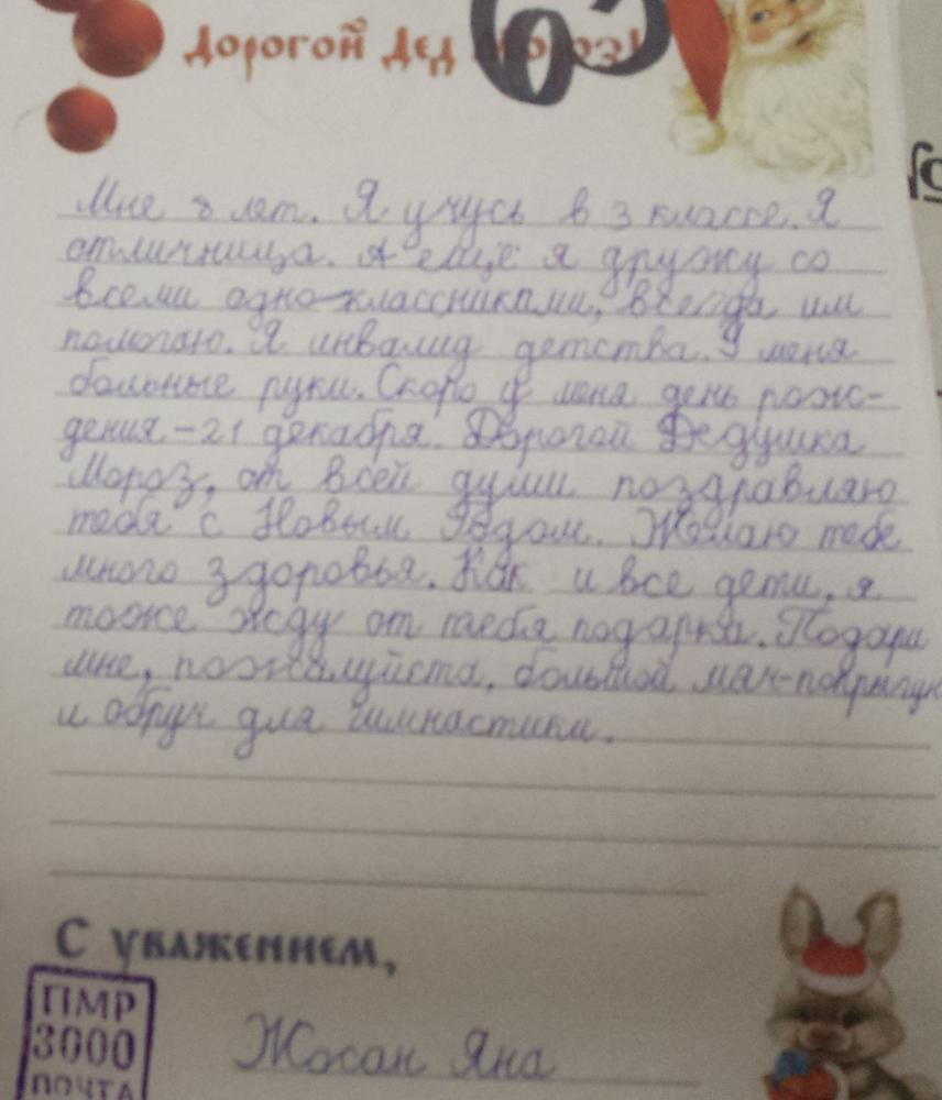 Адреса детей можно узнать по телефону 777-23981 (директор дубоссарской почты Юлия Чеснокова). Здравствуй Дедушка Мороз! Меня зовут Сережа. Я учусь в 4 классе, учусь дома. Я много месяцев не хожу в школу, болею. Учителя приходят домой. Мне скучно дома всё время, мама работает, а я один сижу. Я очень хочу большого конструктора лего. Очень люблю строить и еще хотелось робота, чтоб я мог днем играться. Спасибо! Сережа Вложение 20577 Здравствуй Дедушка Мороз. Меня звать Владимир, я у родителей инвалид. Но я очень люблю учиться, так как я слепой. Но я очень люблю Новый год. И очень люблю ездить на олимпиады. Чтобы обрадовать родителей. Прошу у Вас Дедушка Мороз подарить мне на Новый год от Вас на Ваше усмотрение. Вложение 20576 Дорогой Дед Мороз! Мне 8 лет. Я учусь в 3 классе. Я отличница. А еще я дружу со всеми одноклассниками, всегда им помогаю. Я инвалид детства. У меня больные руки. Скоро у меня день рождения - 21 декабря. Дорогой Дедушка Мороз, от всей души поздравляю тебя с Новым Годом! Желаю тебе много здоровья. Как и все дети, я тоже жду от тебя подарка. Подари мне, пожалуйста большой мяч-попрыгун и обруч для гимнастики. Жосан Яна. Вложение 20578 Пишет тебе Пакул Ваня. Мне 5 лет, но мне помогает писать письмо мой старший брат Саша. Я хожу в специальный садик в городе Дубосары "Центр реабилитации". Я люблю стихи. Еще я люблю играть с машинками и рыцарскими достпехами. Мой любимый Дедушка Мороз - подари мне на Новый Год здоровье и машинку. Я очень тебе буду благодарен за этот чудасный подарок. С уважением, Пакул Ваня!!! Вложение 20579 Здравствуй дорогой, добрый Дедушка Мороз. Пишет тебе Диана Еричина, ученица школы №7 г. Дубоссары. Хочу пожелать тебе в этом Новом Году много счастья, добра, успеха, удачи и снежной зимы. Чтобы твои сани по снежной дороге к нам детишкам ехали быстрее. В этом письме прошу не для себя, а моего младшего братишки инвалида, которому 3 года. Не мог бы ты подарить ему немного здоровья, и еще, пожалуйства, небольшой сюрприз, он мечтает о самокате. Потому что из еды ничего нельзя. Вложение 20580 Здравствуй Дед Мороз! Очень жду тебя в гости. Я стараюсь учиться только на пятерки и получаю звездочки. У меня прилежание и поведение тоже 5 и учительница ставит меня в пример. Моя мечта - стать учителем и свои знания передавать другим детям. Люблю рисовать и делать аппликации. Я знаю, что в Новый Год все пожелания сбываются, поэтому хочу попросить подарок. Пожалуйста, Дед Мороз подари мне альбом для рисования, зветную бумагу и карандаши, спасибо! Чижова Милена, ученица 2Б класса. Вложение 20581 |