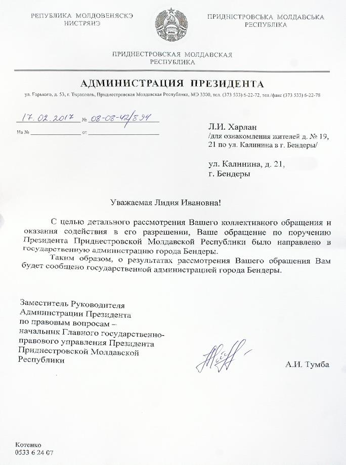 "Получен ответ Администрации Президента на обращение жителей по поводу сквера у домов №19, 21 и на углах улиц Лазо - Калинина, Гагарина - Калинина Материалы поручено рассмотреть городской госадминистрации. Жители города имеют возможность уже на первом этапе оценить справедливость, заботу о городе и людях и вообще, направленность действий новых властей. Народ надеется.