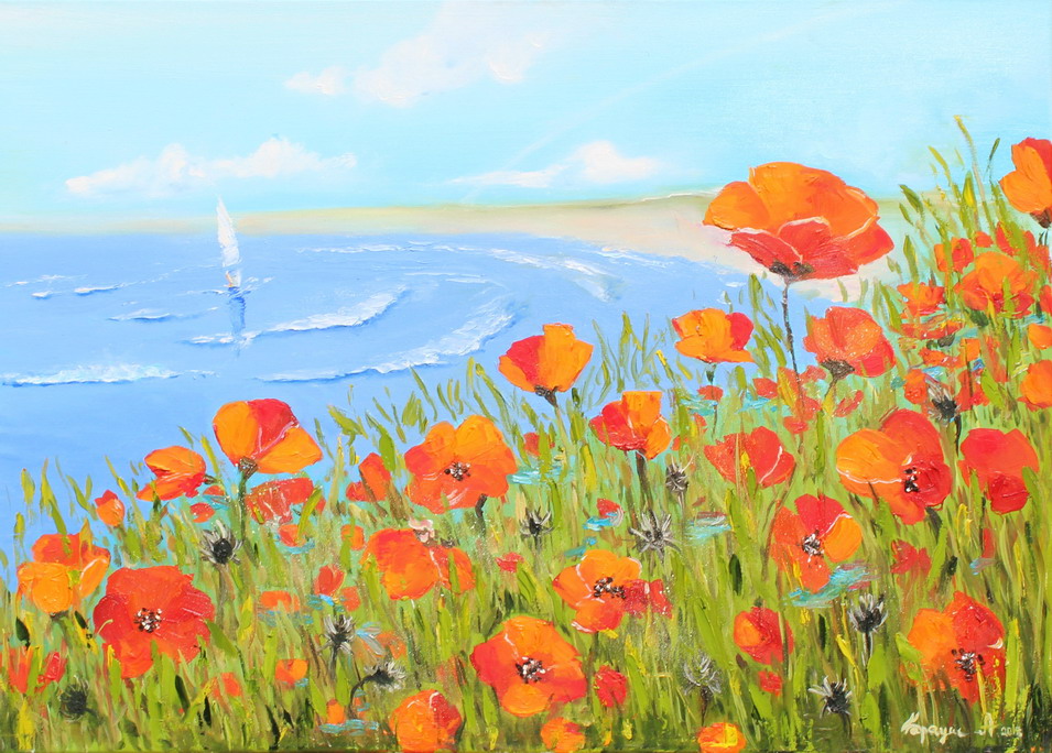 Карауш Арина, 15 лет, "Пейзаж с маками", масло.