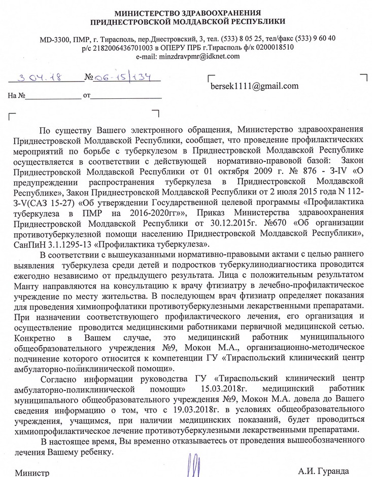 Здравствуйте. Прошу объяснить порядок выдачи лекарства (по результатам "плохой" манту) ребенку для приема в школе №9. В поликлинике №1 фтизиатр Алена Васильевна. выписала бесплатно "Изониазид", который по выписке получает в поликлинике №1 школьный фельдшер Марьяна Александровна, Ребенку "Изониазид" должны давать в школе после обеда. Получить лекарство в может поликлинике №1 только школьный фельдшер. Фельдшер отказывается ездить за лекарством к фтизиатору в поликлинику 1. Фтизиатр не может выдать лекарство родителям ребенка, . Какой порядок получения лекарства из поликлиники в школу в данной ситуации? А еще выяснил, что вообще не надо щас лечиться при плохой манту. т.к. результаты подозрительно плохие по всему ПМР, видимо у многих деток вирус другой есть в крови, что такая реакция, и будут повторно делать манту всем весной. Ответ минздрава: Вложение 24453 |