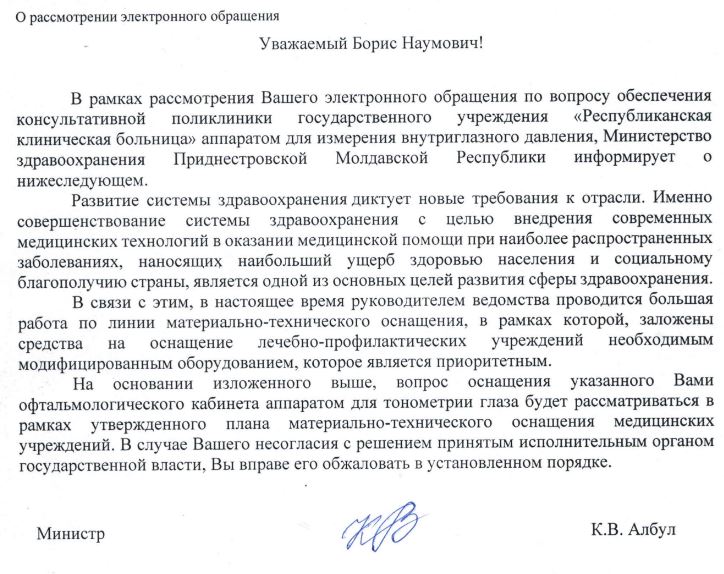 В тираспольской поликлинике №3 в кабинете офтальмолога нет аппарата для измерения глазного давления. Меряют грузиком, потом результаты оцениваются линейкой. А везде (например - лечгородок / поликлиника 1 Бендеры) уже стоит электронный аппарат. Просьба купить аппарат тонометрии глаза в поликлинику №3 г. Тирасполя. 25.10.2024. Получил ответ Минздрава. Вложение 29909 В рамках рассмотрения Вашего электронного обращения по вопросу обеспечения консультативной поликлиники государственного учреждения «Республиканская клиническая больница» аппаратом для измерения внутриглазного давления, Министерство здравоохранения Приднестровской Молдавской Республики информирует о нижеследующем. Развитие системы здравоохранения диктует новые требования к отрасли. Именно совершенствование системы здравоохранения с целью внедрения современных медицинских технологий в оказании медицинской помощи при наиболее распространенных заболеваниях, наносящих наибольший ущерб здоровью населения и социальному благополучию страны, является одной из основных целей развития сферы здравоохранения. В связи с этим, в настоящее время руководителем ведомства проводится большая работа по линии материально-технического оснащения, в рамках которой, заложены средства на оснащение лечебно-профилактических учреждений необходимым модифицированным оборудованием, которое является приоритетным. На основании изложенного выше, вопрос оснащения указанного Вами офтальмологического кабинета аппаратом для тонометрии глаза будет рассматриваться в рамках утвержденного плана материально-технического оснащения медицинских учреждений. В случае Вашего несогласия с решением принятым исполнительным органом государственной власти, Вы вправе его обжаловать в установленном порядке. |