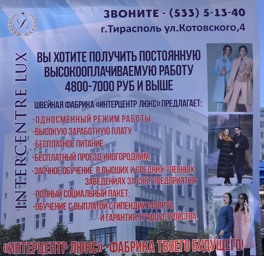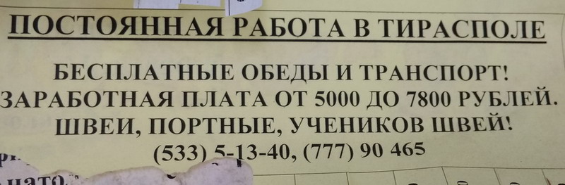 А вот приднестровские предложения о работе в Тирасполе за 5000 - 7800 рублей.