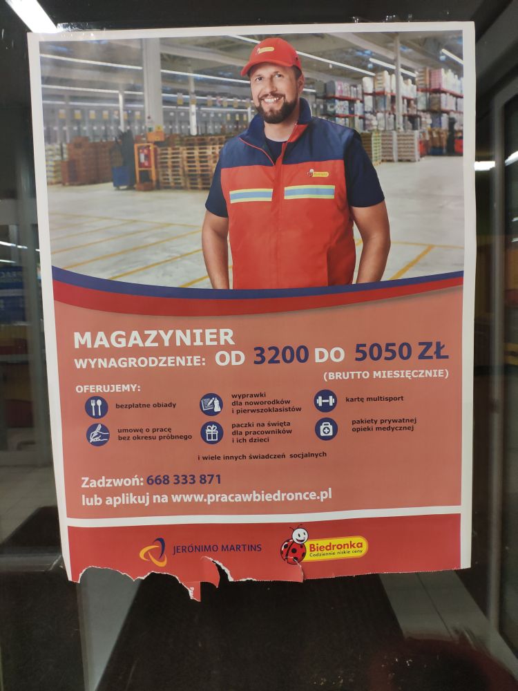 Приезжайте в мой город. Сегодня в одном маркете крупной польской сети "Бедронка" увидел вот такое объявление. Требуется грузчик. Зарплата 3200-5050 злотых в месяц. Кроме этого бесплатные обеда, школьный набор для ребёнка, продуктовые наборы на рождество, карту Multisport (можно бесплатно посещать бассейны, спортзалы и другие спортивные комплекса в городе и дополнительную медстраховку) 1 зл - 4,5 рубля ПМР