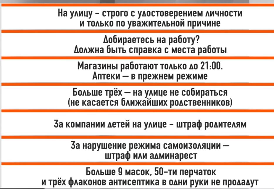 (do_not_enter) запрещены международные, междугородние перевозки пассажиров, движение общественного транспорта (городского, пригородного) на территории Приднестровской Молдавской Республики, за исключением таксомоторных перевозок (do_not_enter) запрещена деятельность объектов торговли непродовольственными товарами, за исключением случаев доставки товара покупателю (do_not_enter) запрещена деятельность продовольственных рынков, за исключением работы закрытых торговых павильонов, с обязательным соблюдением следующих мер: 1) наличие при входе антисептических средств и обработка ими рук покупателей; 2) измерение посредством использования бесконтактных термометров температуры покупателей; 3) наличие у продавцов средств индивидуальной защиты (маска, перчатки); 4) соблюдение карантинной дистанции; 5) соответствие вентиляционной системы Санитарно-эпидемиологическим требованиям (star)Организации независимо от организационно-правовой формы и формы собственности обязаны обеспечить соблюдение карантинной дистанции посетителями, а также наличие при входе антисептических средств и обработку рук посетителей |