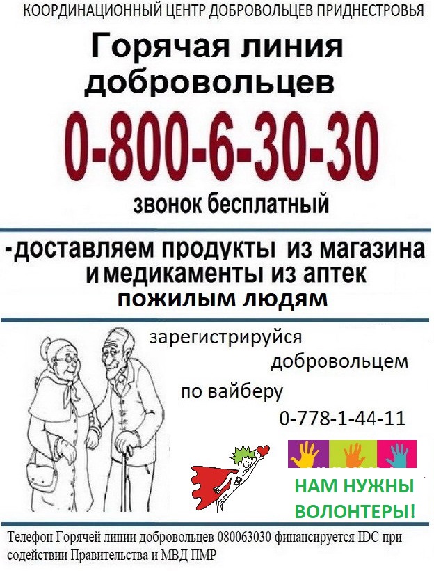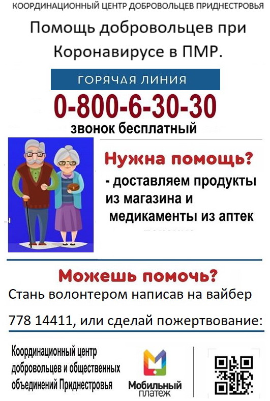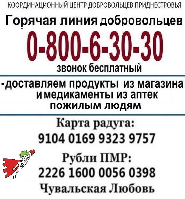 Телефон горячей линии: 0-800-6-30-30. Мы ищем волонтеров которые будут покупать для таких людей продукты и предметы первой необходимости и приносить на дом, где получатели будут оплачивать эти покупки по чеку. Работа волонтеров БЕСПЛАТНАЯ! Бензином не заправляем! Данные для финансовой помощи волонтерам, на антисептик и мобильную связь: НО "Социальное Молодежное Объединение «Добровольцы – это МЫ!» Адрес: г. Тирасполь, ул. Каховская, д. 13/1, кв. 36 MD-3300, Приднестровье Банк: ЗАО «Агропромбанк», г. Тирасполь КУБ 16 Р/с: 2212160000007889 Ф/к: 0200043810 Вложение 27454 Вайбер группа "Помощь по Коронавирусу в ПМР". https://invite.viber.com/?g2=AQAdtjM...LT484xORLKOqQv |