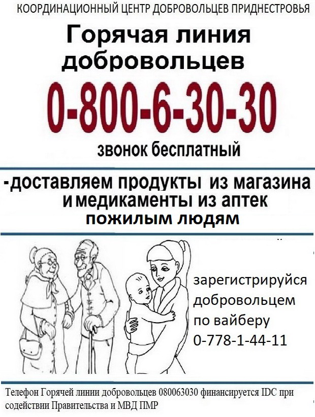 Координационный центр добровольцев Приднестровья по помощи людям в связи с чрезвычайным положением из-за пандемии коронавируса выражает благодарность Правительству, МВД ПМР и Интерднестркому за то, что предоставили добровольцам бесплатный номер 0-800-6-30-30.