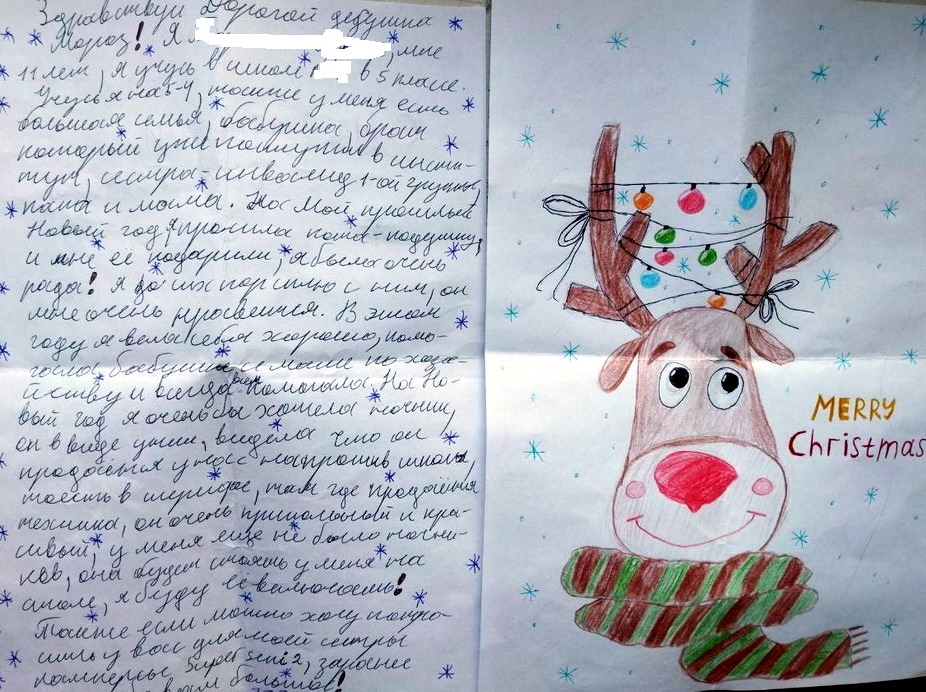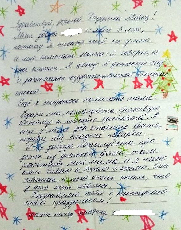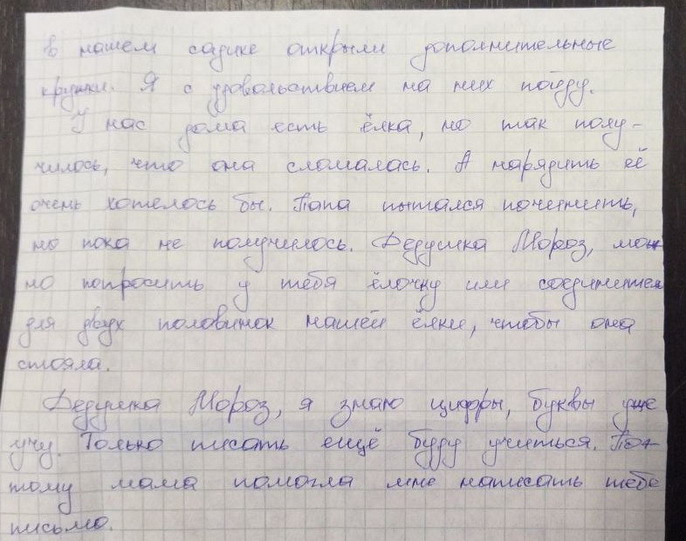 Девочке 5 лет, в семье есть младший брат 3 годика, и сестра 9 лет. Дома сломалась елка, починить не получается. Просят у Дед Мороза елочку. Вложение 29318