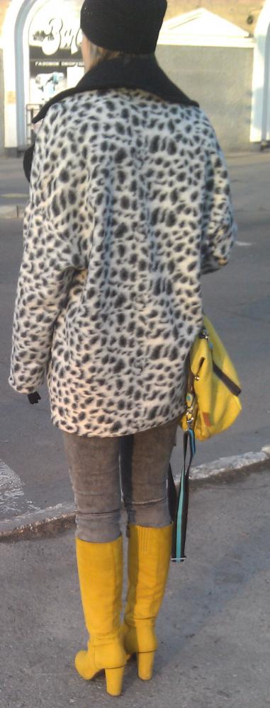 Сегодня девушка привлекала внимание прохожих видимо необычным сочетанием цветов одежды и длинными ногами.. Рядом шла мама.