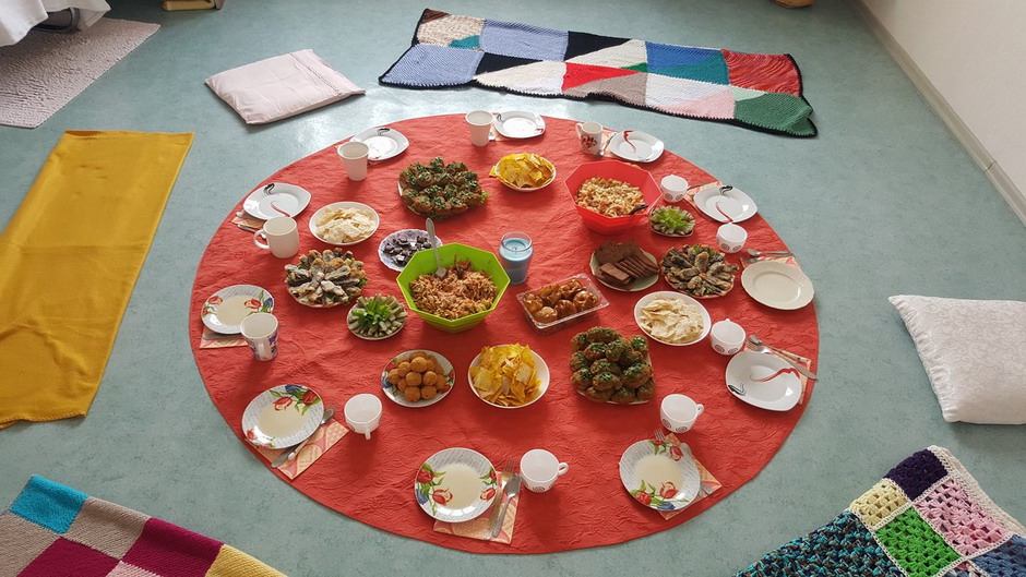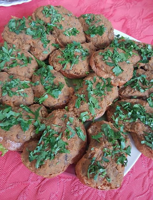 Паштет из чечевицы, шарики из фасоли, чипсы из лаваша, панир обжаренный в Нури, фруктовый салат - это всё вегитарианская еда на тематическом застолье.