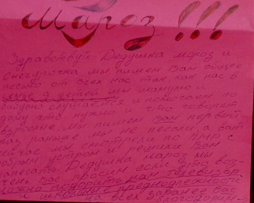 Когда с добрыми сердцами развозили подарки, то какой-о ребенок в Тирасполе по К.Маркса 129 увидел Дед Мороза в окно и заслал бабушку - выяснить, почему дед мороз не принес ему планшет, т.к. он тоже писал письмо на почту.
