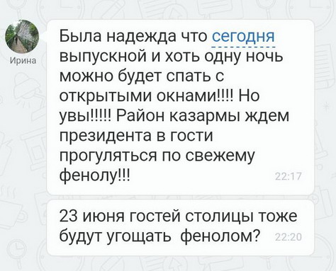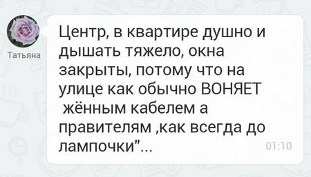 Наталья Б. я сплю с открытыми балконами, не воняет ни вечером, ни ночью, ни утром. Спрашивала бабусек - днем им тоже не воняет. паблики вайбера заполнены враньём, просто кому- то хочется троллить власти, потому что ни единого адреса там не указано. Просто типа "Балка". А Балка большая, я звонила, спрашивала. На Малой земле вони нет, на Старой Балке вони нет, у нас на Текстилях вони нет - где им что воняет? .... о! вот прямо сейчас на Текстилях тянет каким-то тухляком. Не химией, не йодом, не пластмассой, а именно тухлятиной какой-то Ника. Вам крупно повезло, что воздух чистый и не воняет. А у нас на Кировском вонь есть. Я уже писала выше, что примерно неделю назад запах был сильный и ужасный. Вчера и позавчера запах был не такой сильный, но он был. - Это фенол!!!! Только немного стух. Жара стоит несусветная. Вот завтра, говорят, похолодает к ночи и запах фенола будет свежим и ароматным. А пока потерпите, немного тухлятинки) Модные Детки У меня окна выходят прям на самолет и другая сторона на лечгородок. И да. Бывает что воняет только с одной стороны. И 9 этаж как бы.. Я тоже не люблю хайпиться...но реально достало окна закрывать на ночь в страхе |