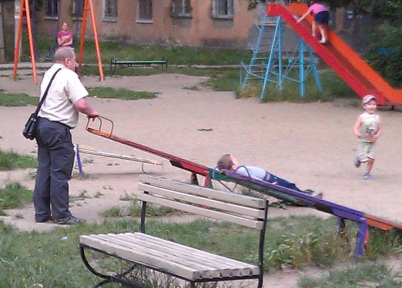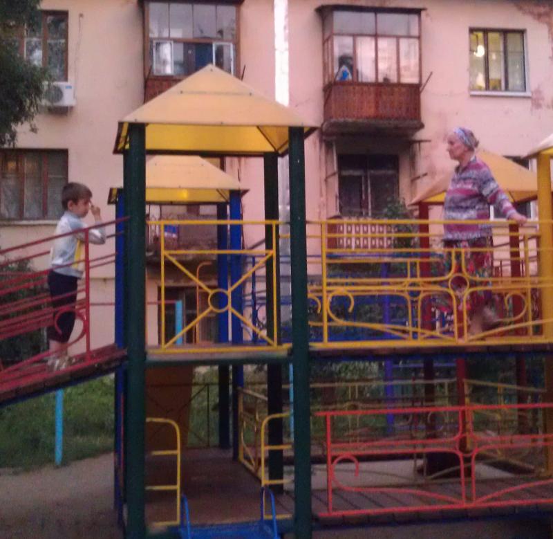 Бабушка играет в детском городке.