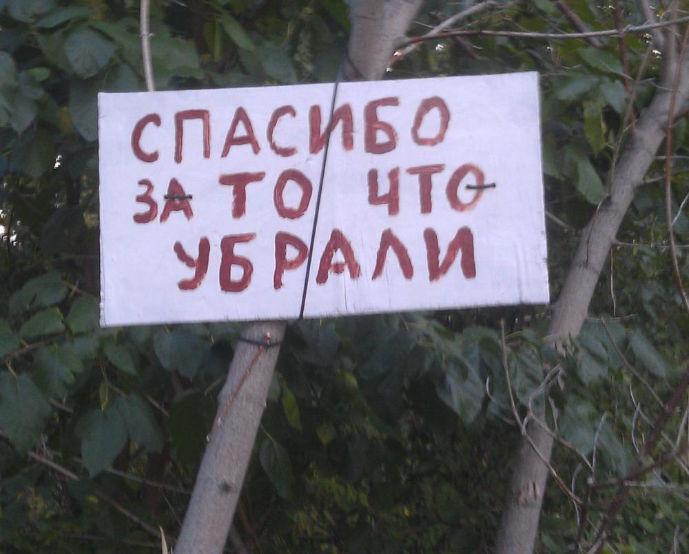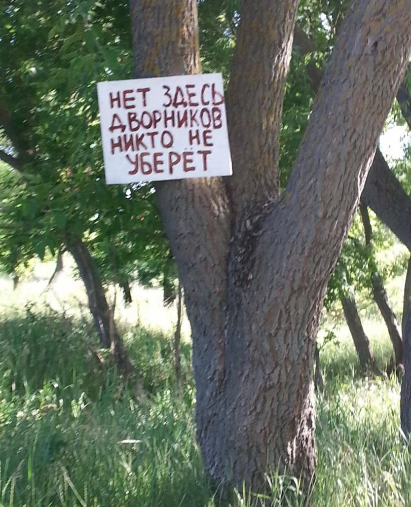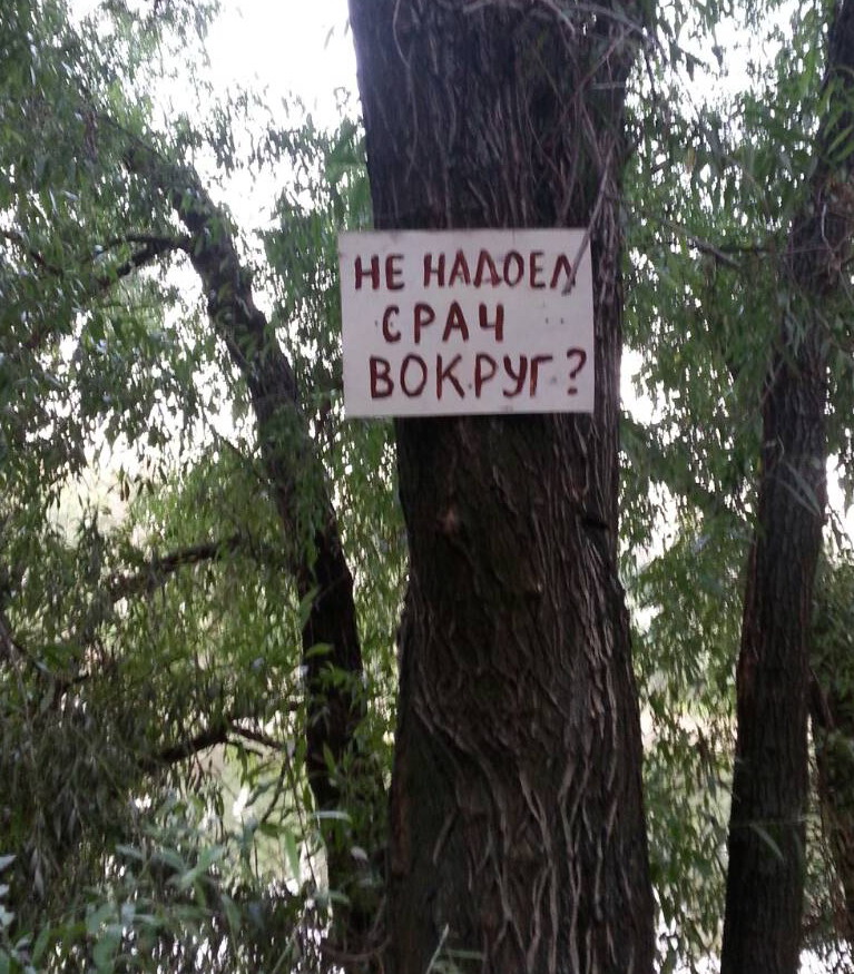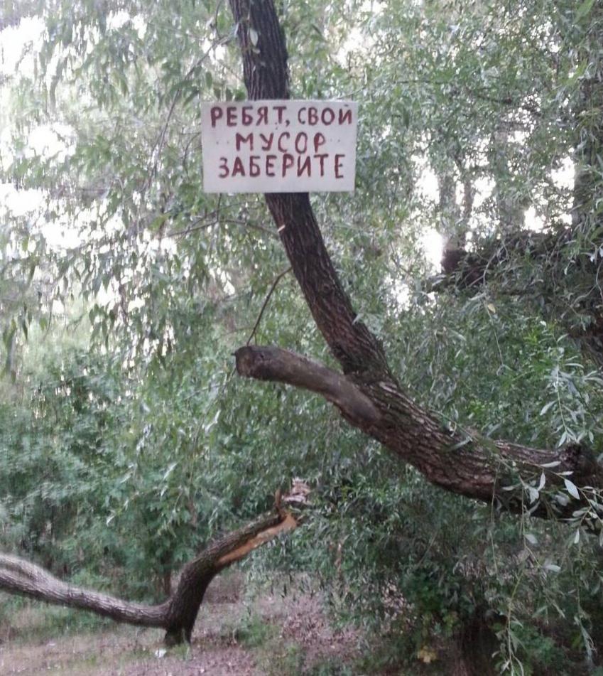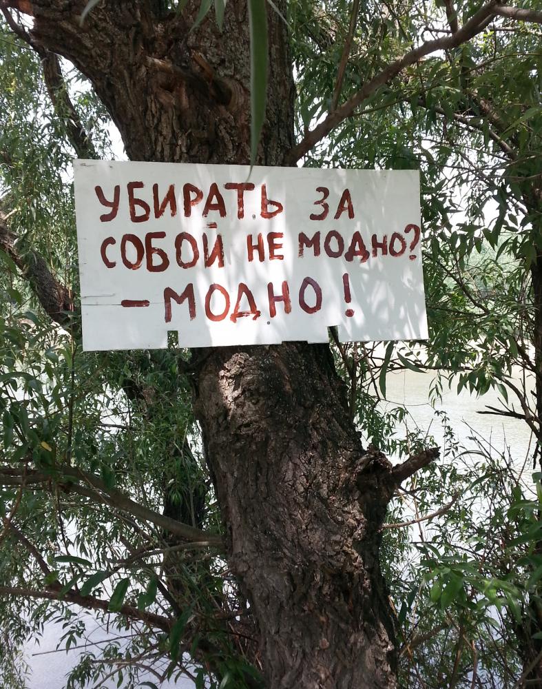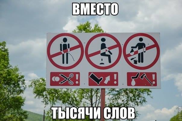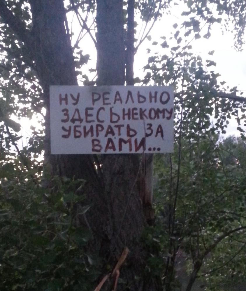 Мусорка - 500м со стрелкой) Территория под охраной. Муосрить ЗАПЕРЕЩЕНО. УБИРАЙТЕ за собой! Мусор НЕ БРОСАТЬ. Провели досуг - УБЕРИ вокруг Не будь свиньей -УБЕРИ за собой. Отдохнул - УБЕРИ за собой. Ну типа того - повелительное наклонение эффективнее на сознание действует. Я пока не думала, первое что в голову пришло. Еще слова красными буквами в начале предложения ВНИМАНИЕ! и.... действует. ) |