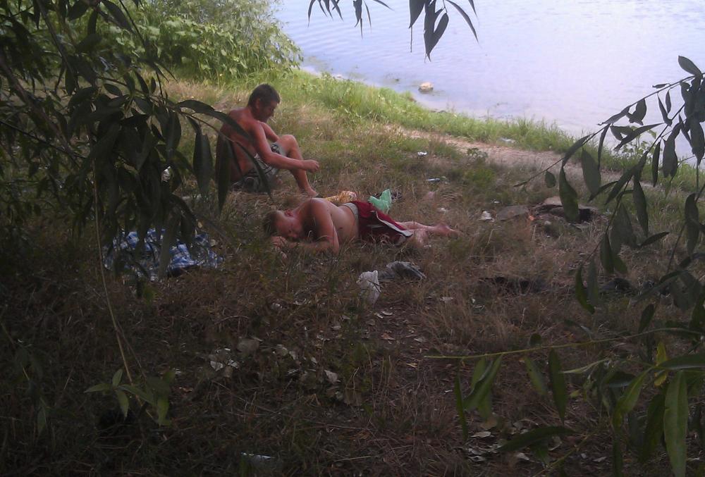 Берег Днестра в Бендерах - пьяные мужики лежат среди мусора.