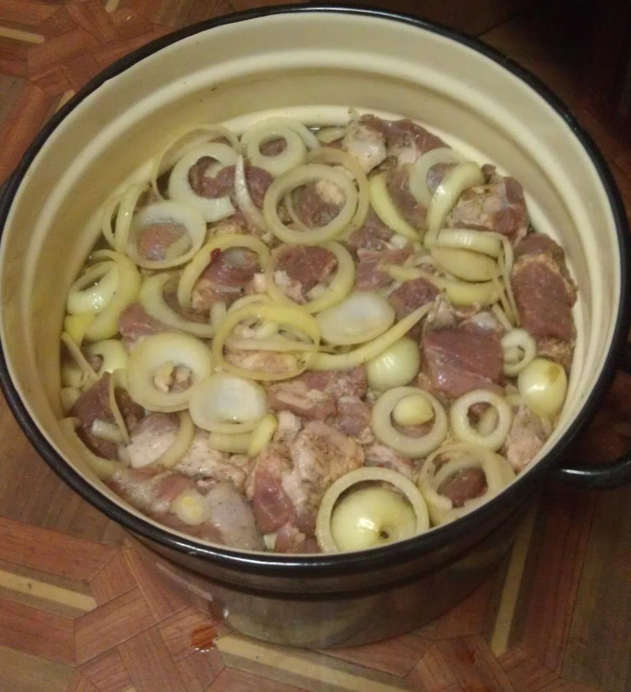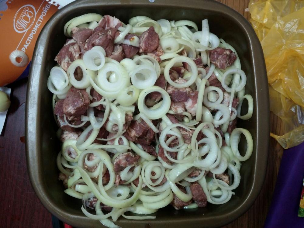 На новый год решили сделать шашлыки на 30 человек, купили 10 кг мяса, вот замариновали с 3 кг лука и 3 литрами прошлогоднего белого вина, специями, солью и перцем.