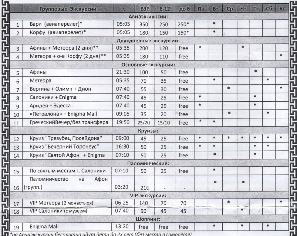 Вложение 23468 *на Авиаэкскурсии бесплатно идут дети до 2х лет (без места в самолёте) **цены на 2х дневные экскурсии указаны с подселение (м+м, ж+ж), за одноместный номер нужно доплатить 20€ Стоимость входных билетов: Дион 8€ Метеоры (1 мон.) 3€ Акрополь 20 € Музей в Акрополе 5 € Вергина 12 € Петралона* 8€ (за дополнительную плату, ходит паровозик (2€)) Ахилео 8€ Музей Белой Башни 4€ Дельфы (музей + Арх.зона) 12€ Аридея (бассейны) Археологический Музей в С Пелла (музей + Арх.зона) 8€ Море в Греции в середине и в конце сентября. Вложение 23437 |