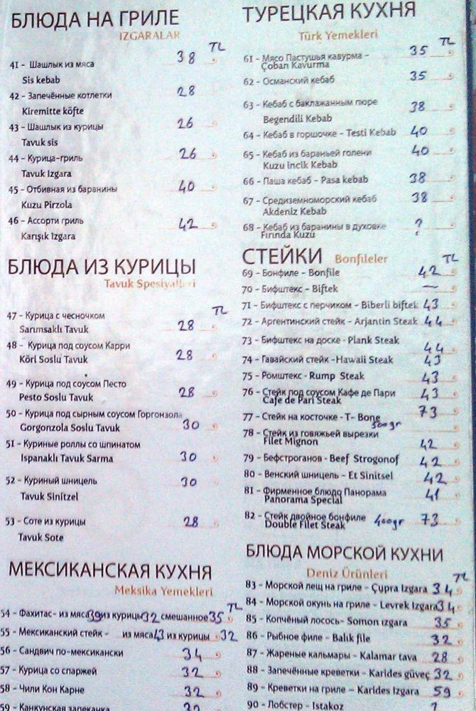 Вот несколько примеров цен на вещи и еду. Вещей в Турции шьют и изгнотавливают в огромных количествах на экспорт, как следствие, живут турки хорошо. В принципе - там всё по 10 евро, только джинсы дорогие )) Вложение 16967Вложение 16968 Кожаные турецкие куртки: женские - от 100$, мужские - от 150$, Вложение 16969Вложение 17210 patlamis misir - попкорн. kabuklu ceviz - очищенные грецкие орехи. Лимоны продаются по 1 евро. Детские крэкеры ulker cubuk kraker - 0,25 лиры, это 10 центов. Турецкий чай Karadem Filiz - 2 доллара. kuruyemis beyaz (Нут белый) - 2.1 лиры Кофе 200 грам - 6 лир очищенный арахис 1 кг - 2,5 доллара Сладости - набор из 5 коробок стоил на базаре 5 евро, а в городе за 5$ - 10 коробок. В супермаркете за 1 лиру продавали 1 коробку. Разброс цен на один товар - огромный. Турецкий чай оказался невкусным. Можно пить чистую заварку. Вложение 16970Вложение 16971 Цены в турецком кафе, меню на русском: Вложение 16977Вложение 16978 |