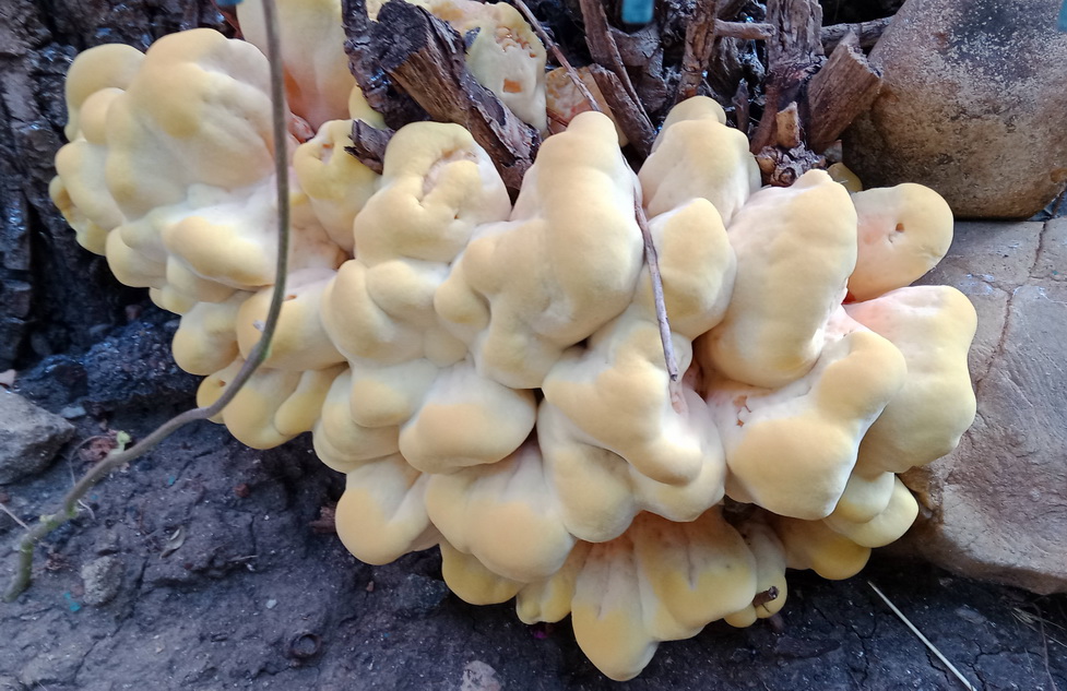 Под спиленным деревом у моего подъезда у дома вырос куриный гриб.