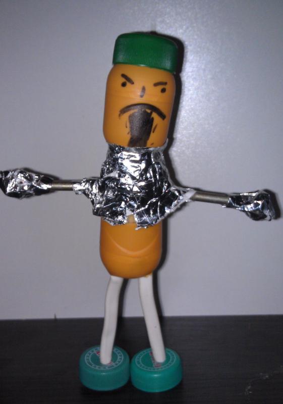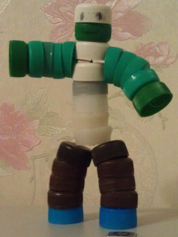 Результат просмотра данной темы - наш первый робот из яиц от киндера и крышек от минералки. Руки - болты. Шея в фольге - горлышко бутылки. Целый час ушел на изготовление поделки.