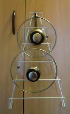 Самая простая подставка для крышек это два привинченных саморезов с внутренней стороны двери шкафа http://i74.servimg.com/u/f74/15/79/55/18/2013-011.jpg Чуть сложнее конструкция без никаких чертежей крепится к внутренней стороны двери шкафа или ещё куда. http://i74.servimg.com/u/f74/15/79/55/18/2013-012.jpg http://i74.servimg.com/u/f74/15/79/55/18/2013-014.jpg Или смастерить что нибудь подобное из дерева http://i74.servimg.com/u/f74/15/79/55/18/2013-015.jpg |