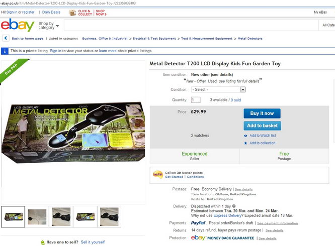 http://s52.radikal.ru/i137/1403/a7/66ba42ef5ab4.jpg Вроде бы ничего необычного. Металлодетектор, правда странного вида. Переписываем "модель" с коробки, скидываем в яндекс, и вуаля! Вложение 13211 Мы видим наглядно цену - 29,99. Коробка и изображение детектора явно совпадают. Из названия становится понятно, что это детская игрушка, применяемая разве что детьми в саду, закапывающими монетки. Но мы не из слабонервных, пишем письмо, с просьбой узнать цену сего агрегата, и получаем...... ТА-ДА! http://s018.radikal.ru/i510/1403/00/1cb56c57f7ab.jpg Итак, кто готов выложить 150$ за игрушечный детектор стоимостью 30 фунтов? |