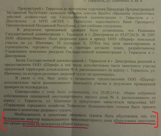 А теперь по теме! Сильно! Меньшинству реально не повезло! Они выносят во двор в ведре фиекалии и выливают всё. Скоро там будет запах стоять на весь район. [facepalm] Вложение 14881 Вложение 14882 Странная проверка прокуратуры... Логика страдает. А еще нет никаких подтверждающих документов с результатами собрания жильцов. |