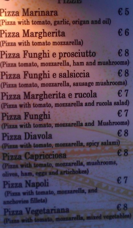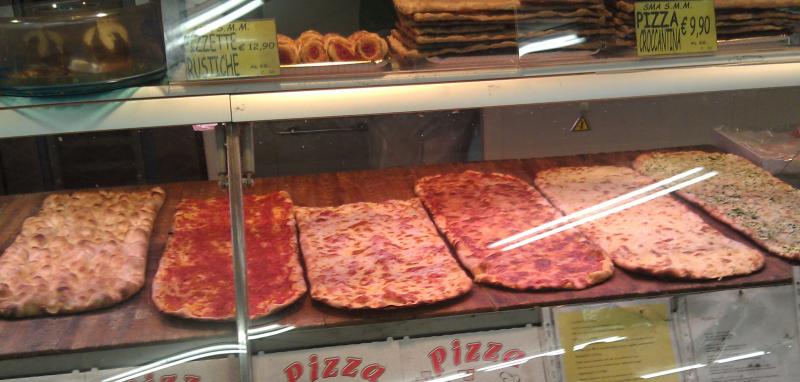 В супермаркетах пицца подешевле - разагревают, но самая невкусная, есть еще у всяких арабов, по 1-2 евро за 100 грам, тоже нагревают, чуть получше.