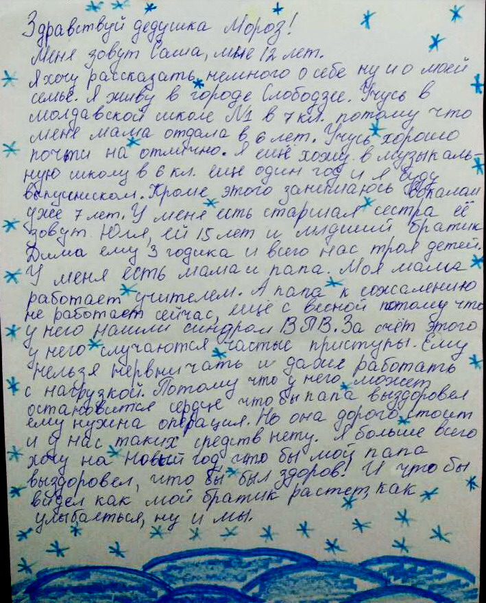Мальчику Саше 12 лет. Он из Слободзеи, учится в молдавской школе почти на отлично, ходит в музыкальную школу, занимается вокалом 7 лет, есть братик и сестричка. Мама - учитель. Но у него болеет папа (синдром ВПВ Вольфа-Паркинсона-Уайта - проявляется как аритмия, от нагрузки будет инфаркт), и Саша в новом году очень хочет чтоб его папа выздоровел.
