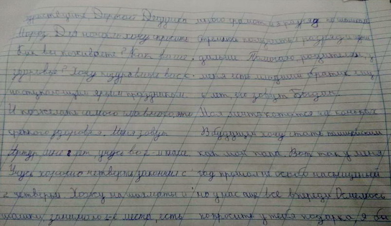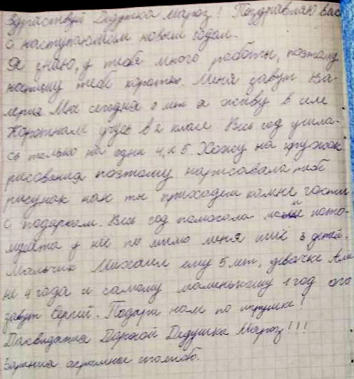 А больше всего хочет чтобы в Приднестровье были достойные зарплаты и мама и папа его приехали из Москвы и жили с ним. А еще желает Деду Морозу счастья и радовать детей. Вложение 23784 |