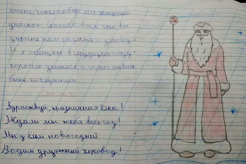 Алине 4 года, письмо помогала писать сестра Аня, ей 12 лет. Алина красиво рассказывает стишки, и мечтает получить на новый год книжку и конфетки с мандаринками.