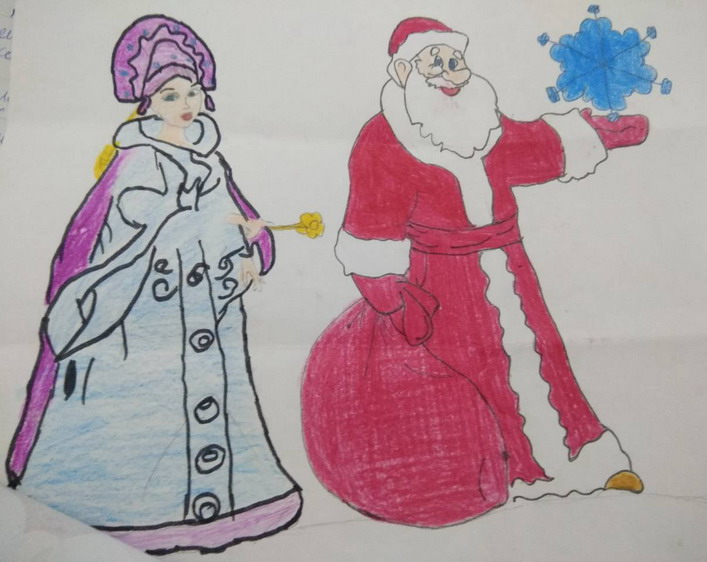 Ксюша ходит во второй класс. Занимается рисованием, дарит Дедушке морозу рисунок, приглашает в гости и просит подарить по игрушке ей и ее братьям и сестрам.