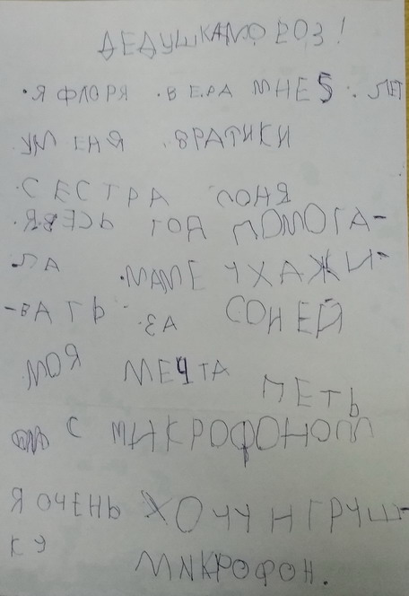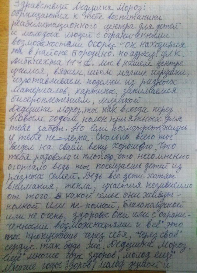 Письмо от детей из реабилитационного центра ОСОРЦ с ограниченными возможностями. Возраст детей от 10 лет. Тирасполь, район Бородино, ул. К. Либкнехта 144а.