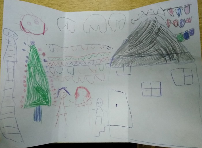 Матвею 7 лет. Он дарит рисунок Дедушке Морозу и мечтает получить на Новый Год динозавтра на пульте и лего.