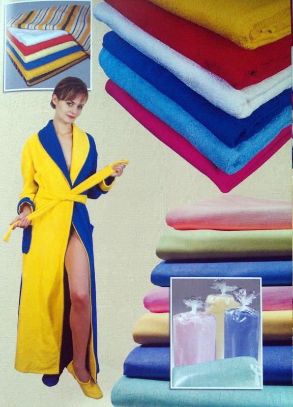 Несколько фото продукции ТИРОТЕКС: домашняя и спортивная одежда, всё для кухни, постельное бельё, разные полотенца.