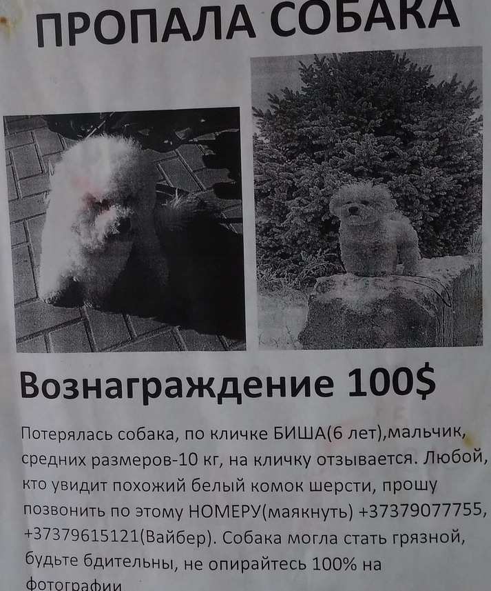 На днях в тирасполе увидел вот такое объявление о пропаже собаки и вознаграждении в 100$.