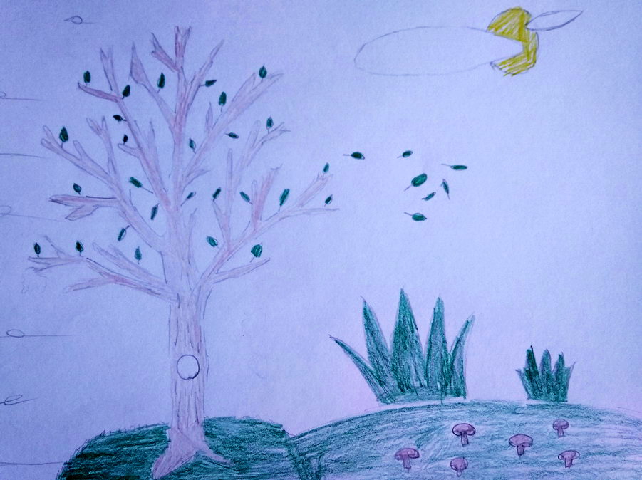 Вот еще недавний рисунок моего сына, ему 9 лет. Мне нравиться, как листья летят на рисунке.