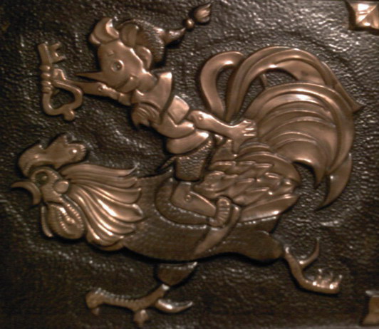 Вот есть дома картина - Буратино с золотым ключиком в руках скачет на петухе.