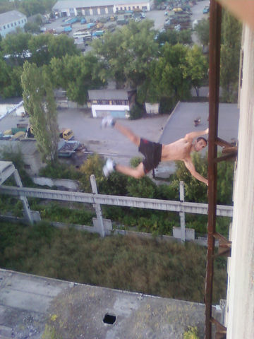 Разве-что руки соскользнут с железки и сломает себе голову или все косточки парень, если останется живой.