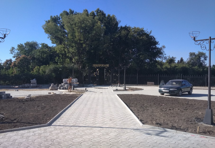 В Дендропарке уже почти сделали новый вход и фасад, чуть вырезав на углу деревья.