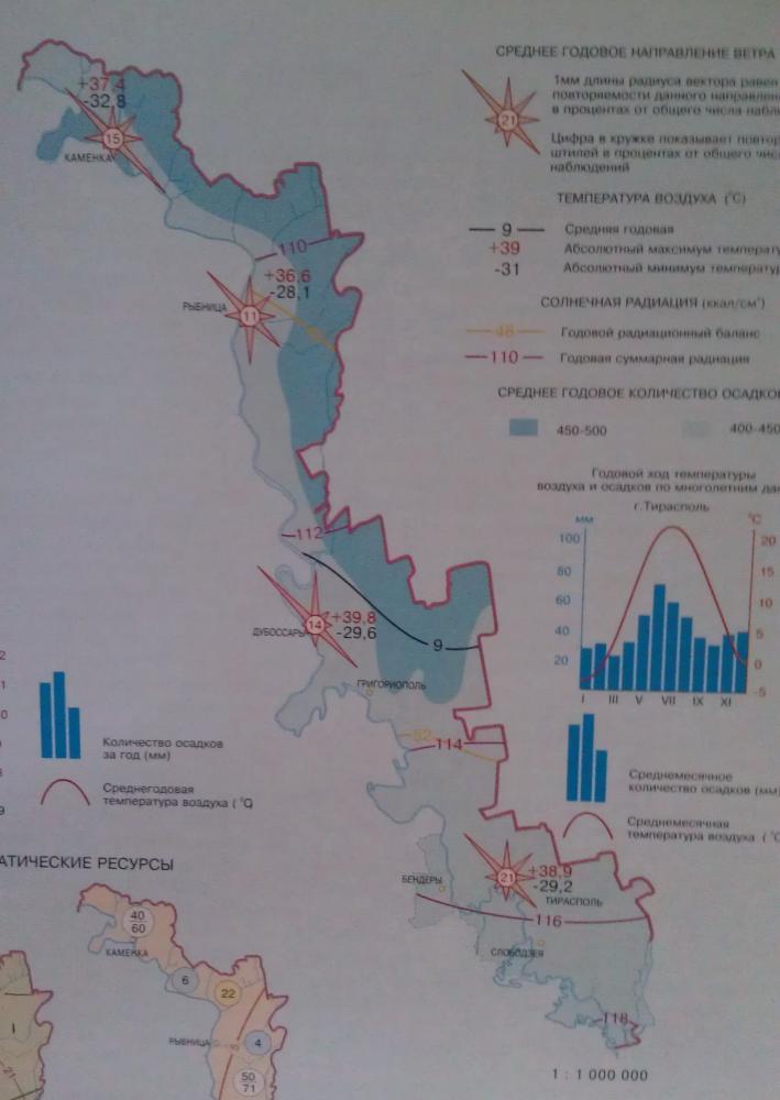 Зима в регионе теплая и влажная. Холодные дни часто сменяются оттепелями и безморозными днями. Это связано с проникновением атлантических и средиземноморских теплых и влажных воздушных масс, вызывающих повышение среднесуточных температур воздуха выше 5°С. Преобладает облачная и пасмурная погода, с осадками в виде дождя и снега. Снежный покров маломощный, неустойчивый. Образуются метели, гололед, однако повторяемость их небольшая. Среднемесячная температура января -4°С, возможны морозы до -33°С. Весна характеризуется большой изменчивостью погоды. Нередки резкие смены потеплений и похолоданий, дождливых и сухих периодов. В конце марта происходит устойчивый переход температуры воздуха через 5°С, во второй декаде апреля через 10°С. Однако возможность заморозков сохраняется даже в мае. Лето солнечное, жаркое и засушливое. Осадки летнего периода чаще всего ливневого характера, иногда сопровождаются сильным ветром и градом. Высокие температуры воздуха устойчивы. Средняя температура июля 21 - 22°С, максимальные температуры достигают отметки 40°С. Часто дуют суховеи (на юге до 36-38 случаев в году), иногда вызывающие черные бури. Осень в Приднестровье теплая и продолжительная. Среднесуточная температура воздуха ниже 10°С опускается в октябре, а ниже 5°С в конце первой половины ноября. Первые заморозки иногда отмечаются в конце сентября, чаще в середине октября. Регион обладает значительными рекреационными (для отдыха) и агроклиматическими ресурсами, благоприятствующими выращиванию многих теплолюбивых культур (виноград, абрикос, персик, черешня, сахарная свекла, подсолнечник, помидоры, зеленый горошек и др.). |
