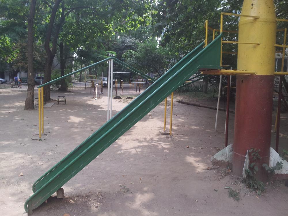 Качество фото плохое, но нет сейчас в наличии USB шнурка и вай фая на модеме, чтобы напрямую скинуть эту фотку. Наклон слишком резкий, горка металлическая, довольно длинная. Ну и на подъеме там свалиться нефиг делать. А теперь представьте, что трех-четырехлетний ребенок на ней катается. |