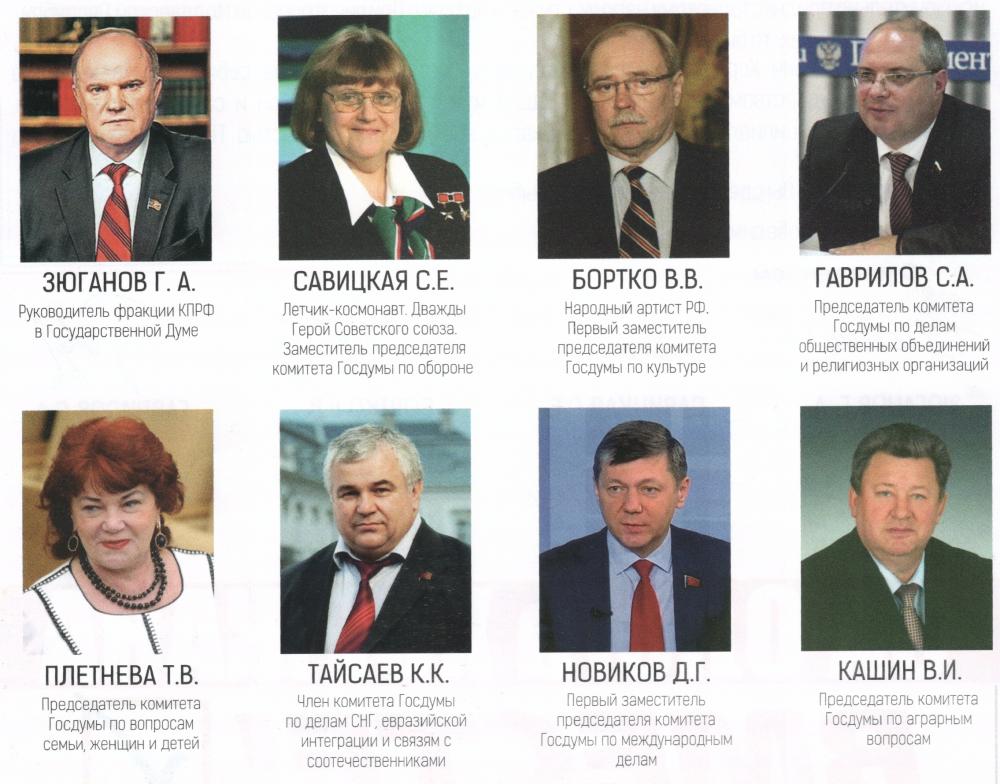 Вложение 20241 ЗЮГАНОВ Г. А. - Руководитель фракции КПРФ в Государственной Думе ГАВРИЛОВ С.А. - Председатель комитета Госдумы по делам общественных объединений и религиозных организаций САВИЦКАЯ С.Е. - Летчик-космонавт. Дважды Герой Советского союза. Заместитель председателя комитета Госдумы по обороне БОРТКО В.В. - Народный артист РФ. Первый заместитель председателя комитета Госдумы по культуре ПЛЕТНЕВА Т.В. - Председатель комитета Госдумы по вопросам семьи, женщин и детей ТАЙСАЕВ К.К. - Член комитета Госдумы по делам СНГ, евразийской интеграции и связям с соотечественниками НОВИКОВ д.г. - Первый заместитель председателя комитета Госдумы по международным делам КАШИН В.И. - Председатель комитета Госдумы по аграрным вопросам |